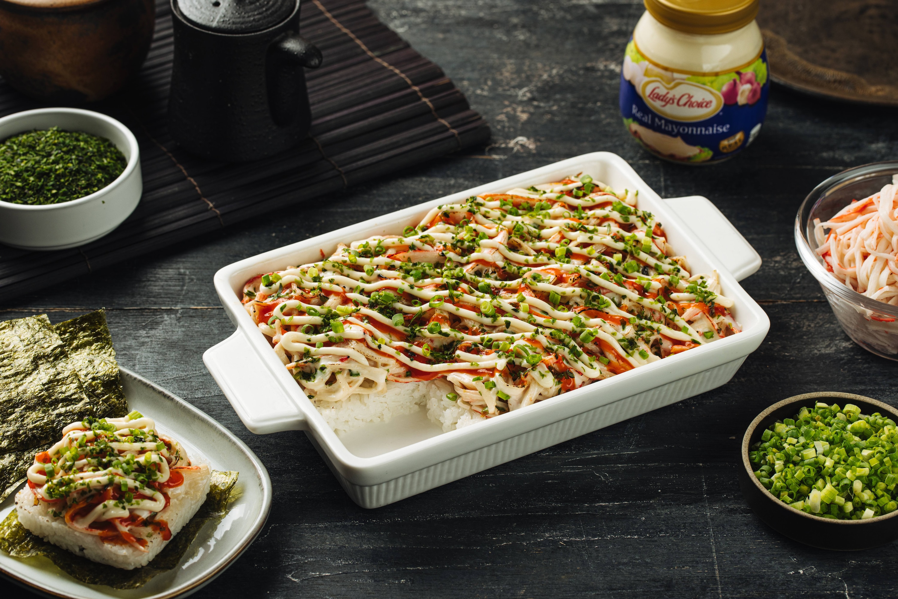 In a bowl, combine Lady's Choice real mayonnaise and soy sauce. Mix in crabsticks.